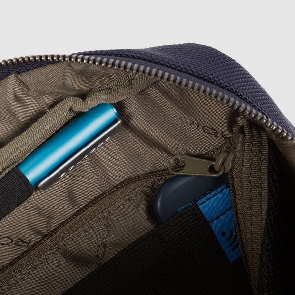 Astuccio portacavi Piquadro in tessuto e pelle blu, progettato per organizzare cavi e accessori con eleganza. Un accessorio sofisticato che unisce praticità e design raffinato, ideale per chi desidera mantenere ordine senza rinunciare allo stile.