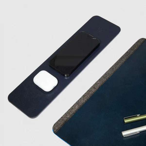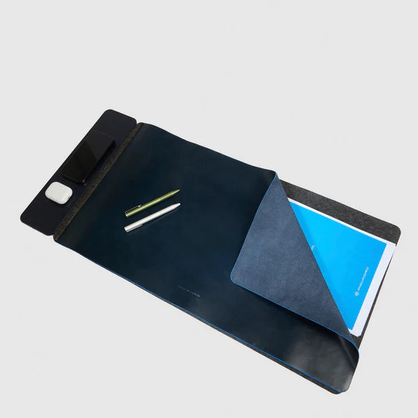 Sottomano da scrivania Piquadro in elegante colore blu, dotato di base di ricarica integrata. Unisce funzionalità moderna e design raffinato, offrendo una superficie di lavoro sofisticata e la comodità di ricaricare i dispositivi in modo efficiente senza rinunciare allo stile.
