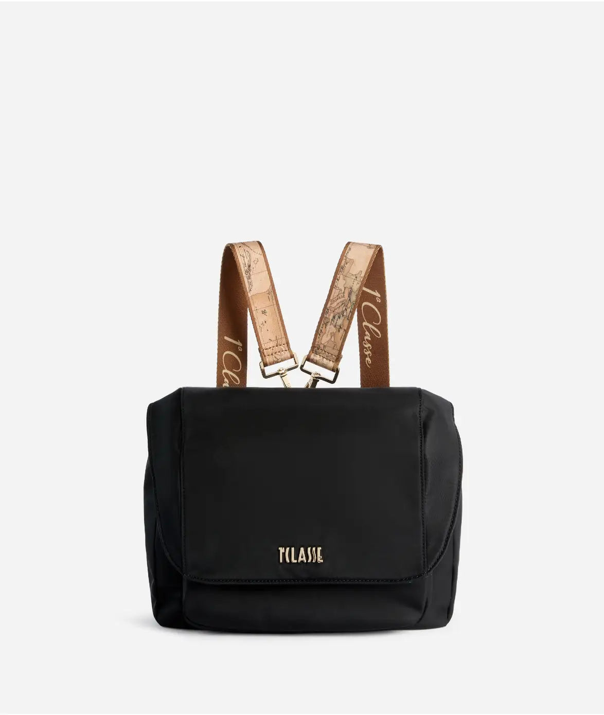 Zaino da donna trasformabile in tracolla firmato Alviero Martini 1^ Classe, in un elegante colore nero. Caratterizzato da una pratica patta, unisce versatilità e stile raffinato, perfetto per chi cerca un accessorio sofisticato e funzionale per ogni occasione.