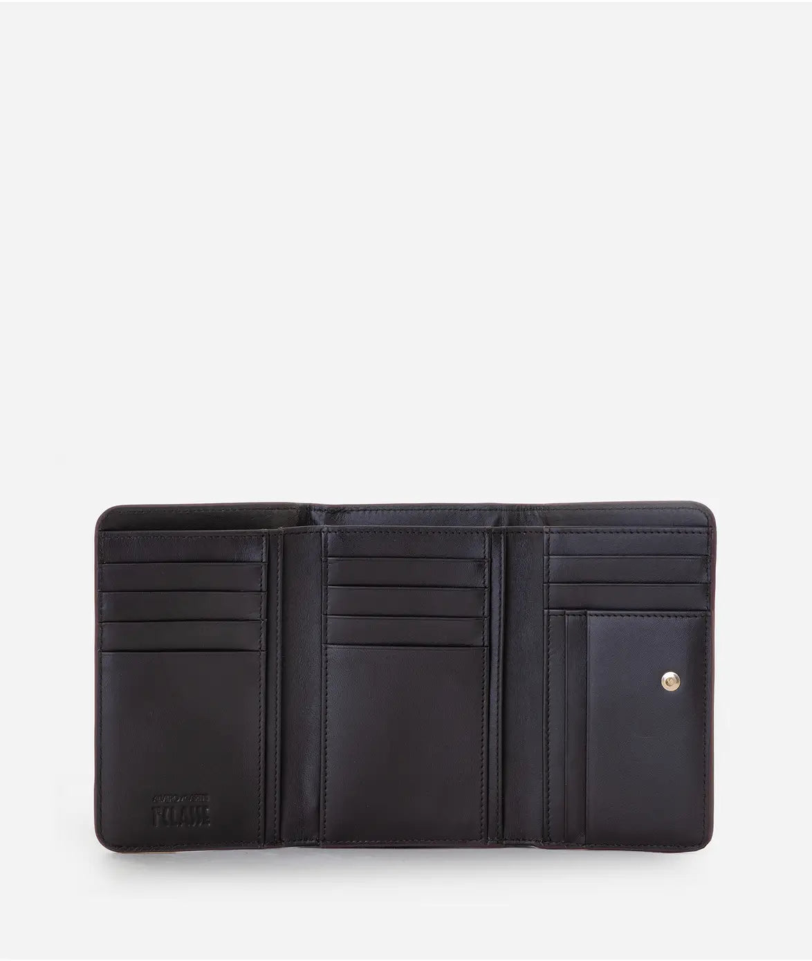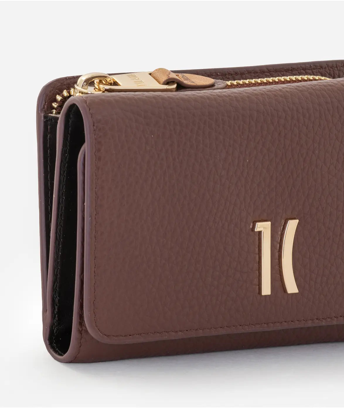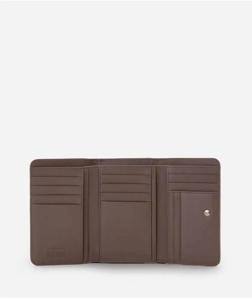 Portafoglio bifolder medio da donna firmato Alviero Martini 1^ Classe, disponibile nei delicati colori mogano e tortora. Questo accessorio unisce design elegante e funzionalità, offrendo un’organizzazione efficace per carte e contanti in un formato compatto e raffinato.