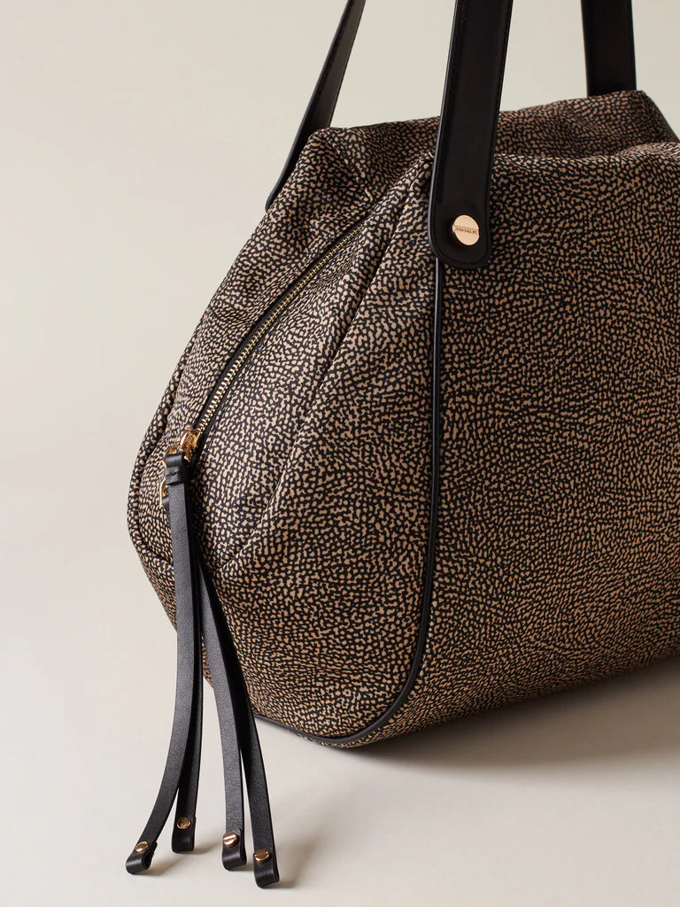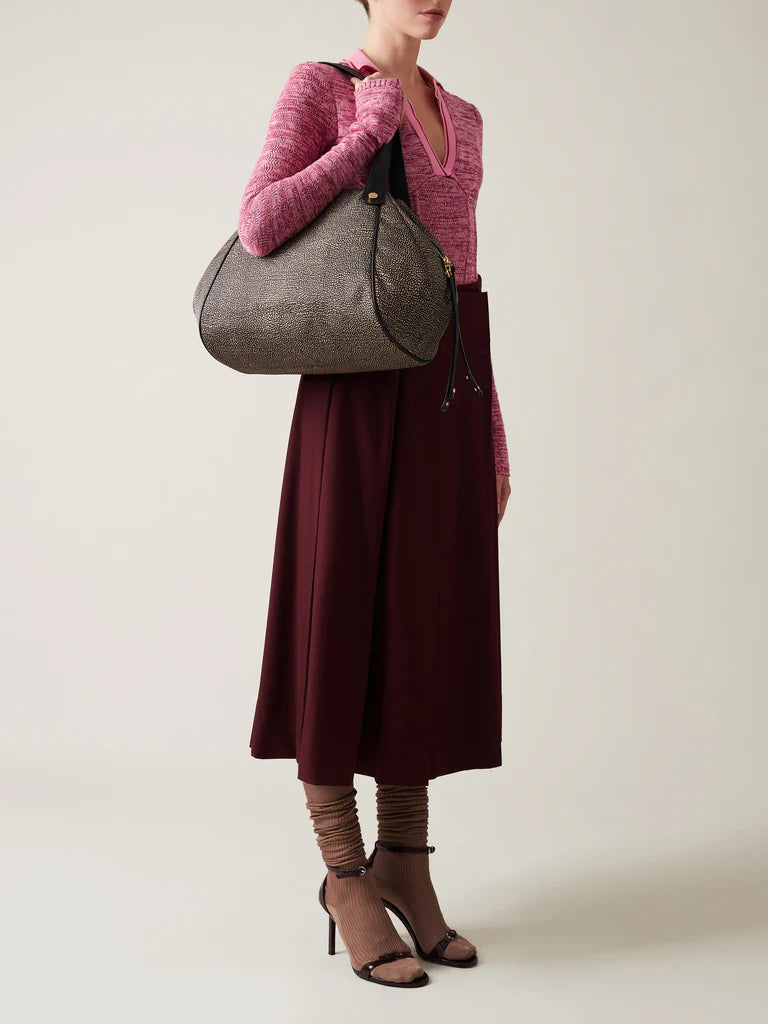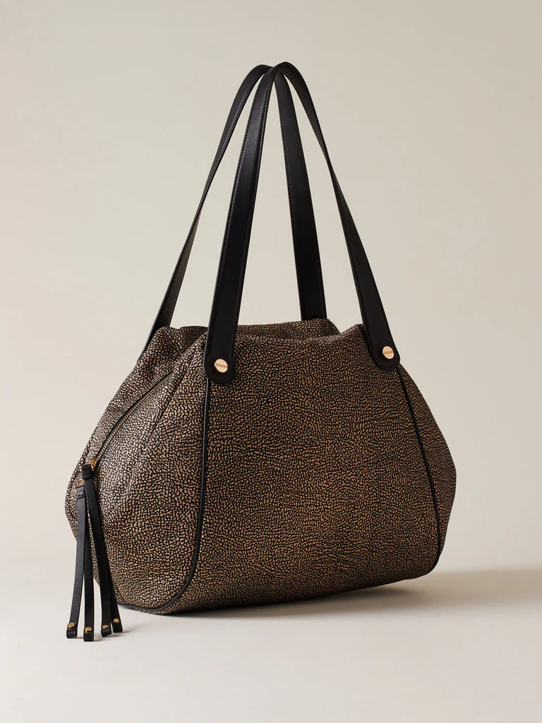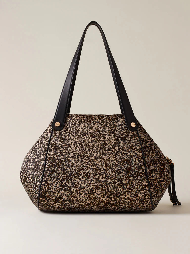 Questa borsa a spalla media da donna Borbonese, nel sofisticato colore naturale/nero, unisce eleganza e funzionalità. Capace di accompagnare con stile ogni occasione, rappresenta un accessorio raffinato e versatile per la donna moderna.