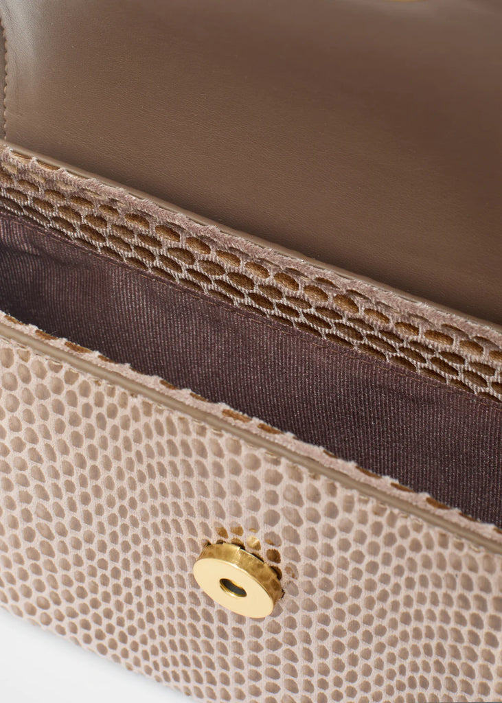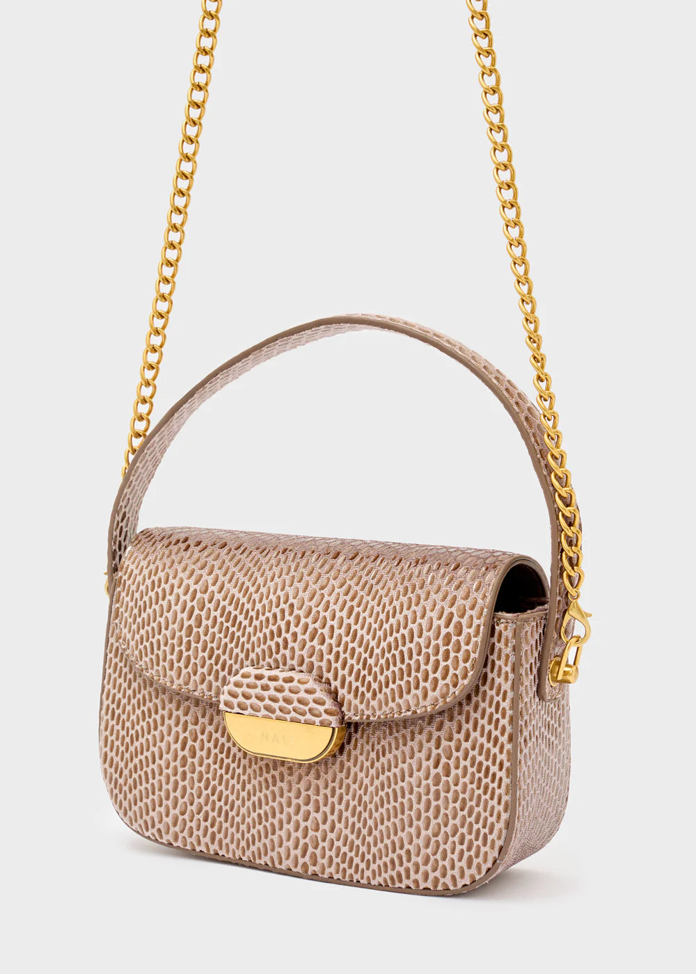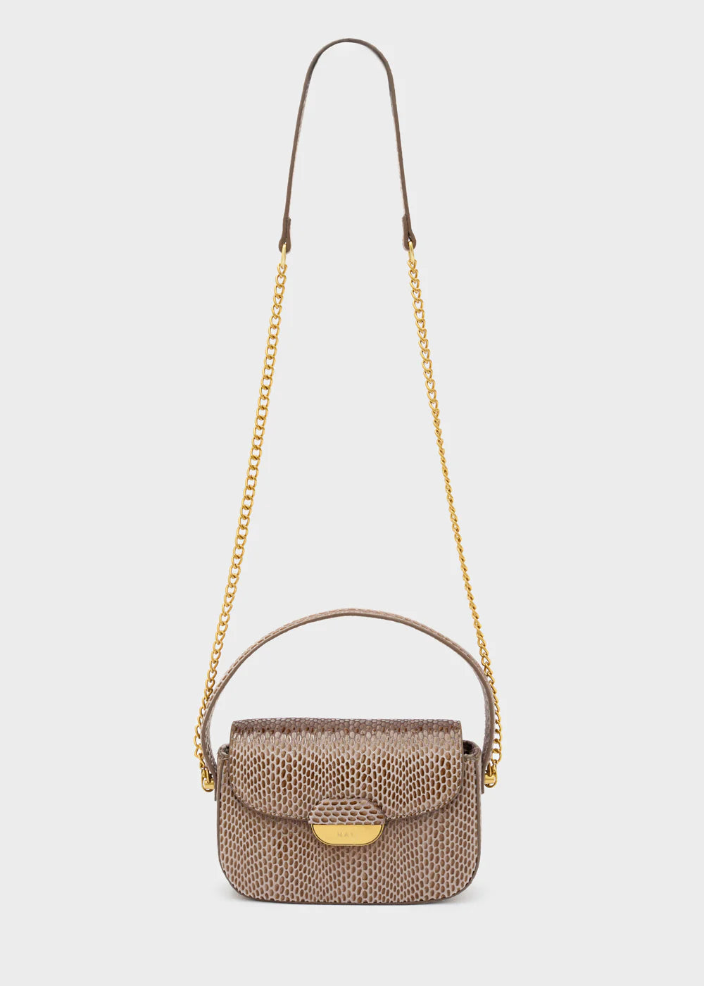 La borsa a mano modello Gia di Nalì, realizzata in tessuto marrone, combina eleganza e funzionalità con la praticità della patta. Un accessorio sofisticato che valorizza ogni outfit con un tocco di classe e discrezione, ideale per la donna contemporanea.