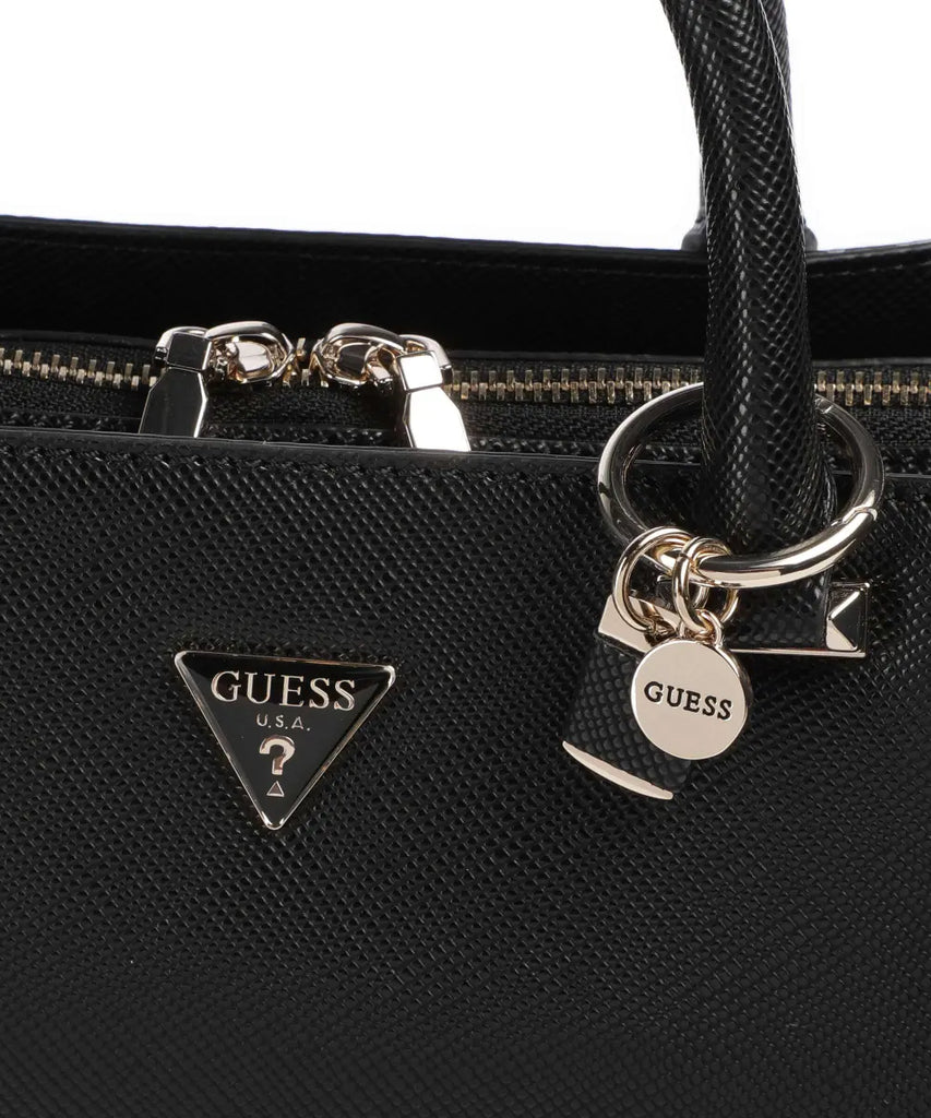 Borsa a mano da donna Guess nei raffinati colori nero e panna, perfetta per chi cerca eleganza e versatilità. Dotata di tracolla inclusa per un comodo trasporto e di una tasca esterna pratica, combina stile sofisticato e funzionalità, ideale per completare qualsiasi look con un tocco di classe discreta.