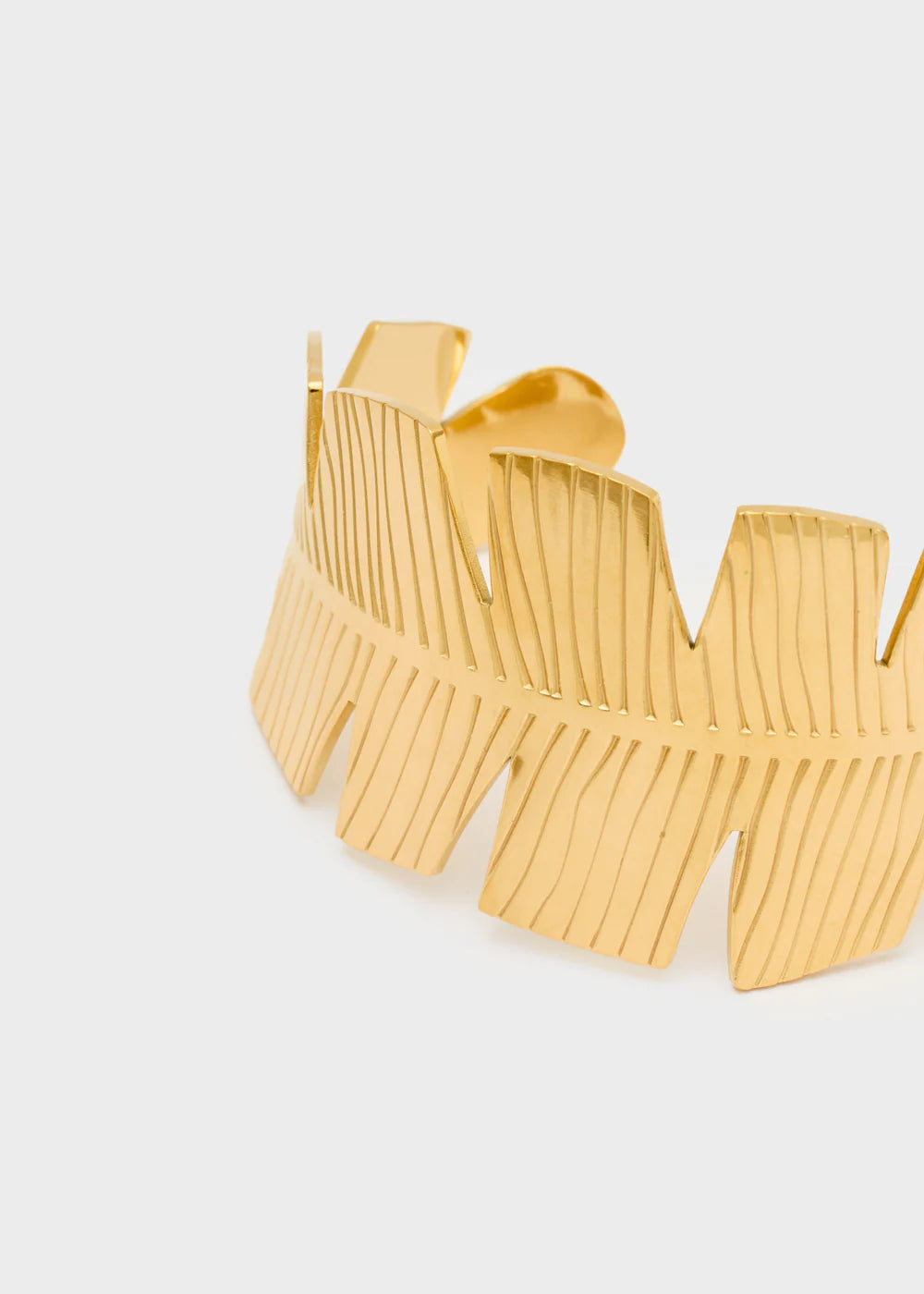 Il bracciale rigido da donna Nalì in oro è arricchito da un delicato motivo di foglie, che conferisce un tocco di eleganza naturale e raffinata. Un accessorio sofisticato, perfetto per impreziosire con stile ogni look femminile.