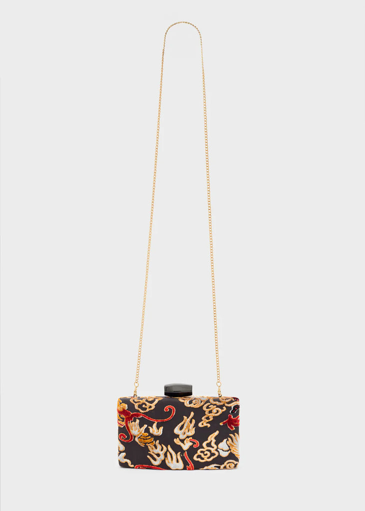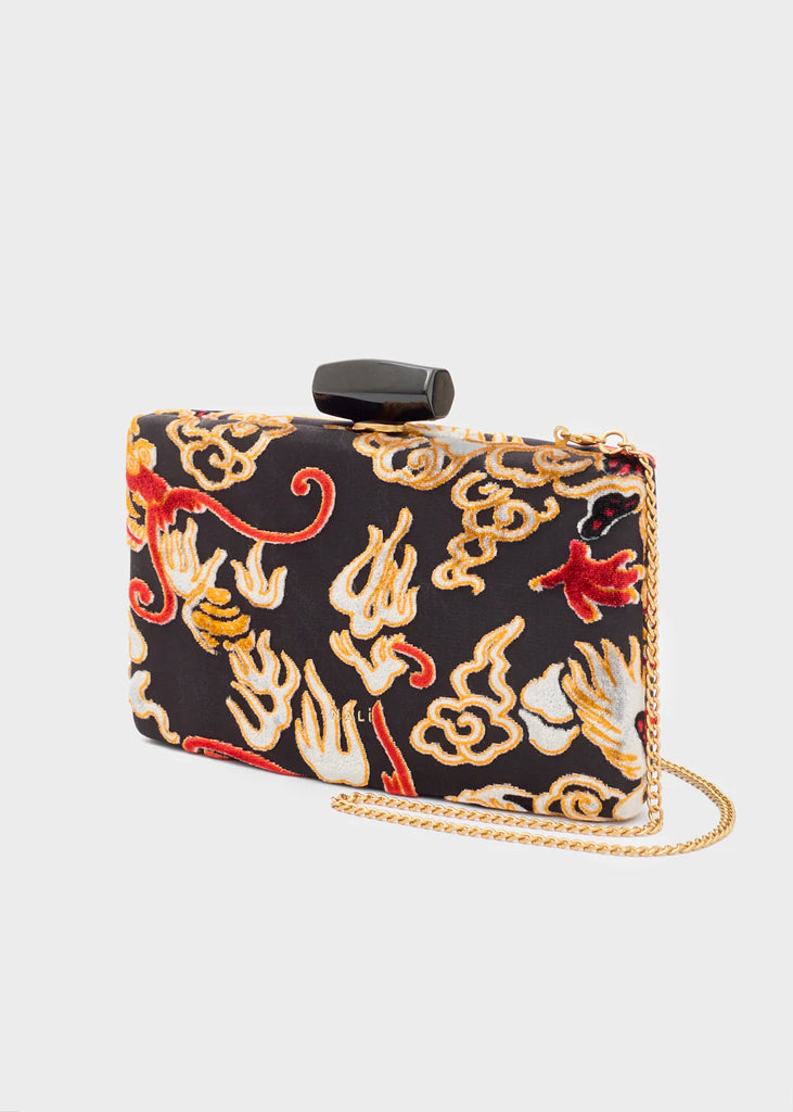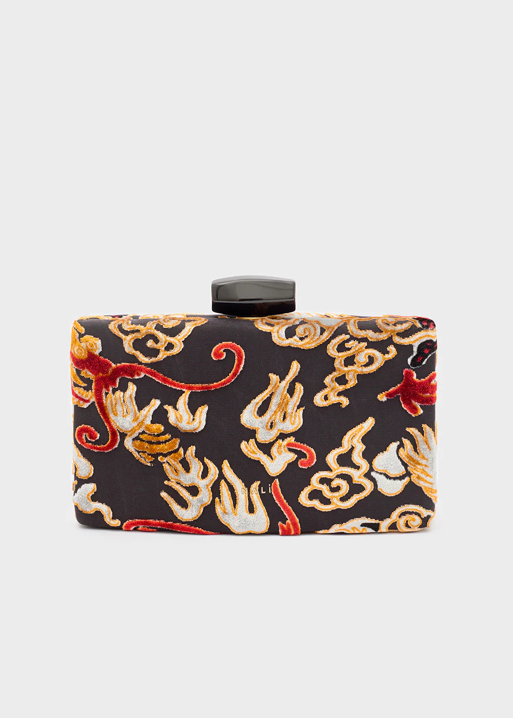 La clutch da donna in velluto firmata Nalì si distingue per il raffinato disegno di un dragone, che aggiunge un tocco di mistero e originalità al colore nero intenso. Questo accessorio sofisticato unisce materiali pregiati e design esclusivo, ideale per completare con eleganza e carattere ogni look serale.