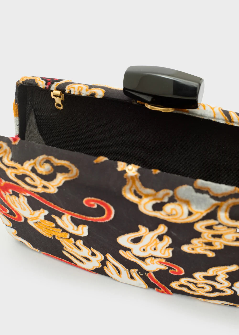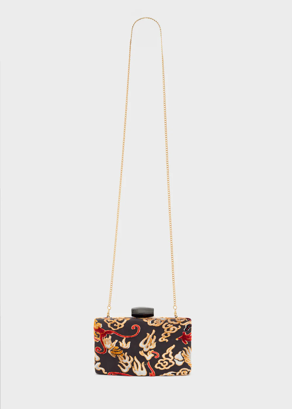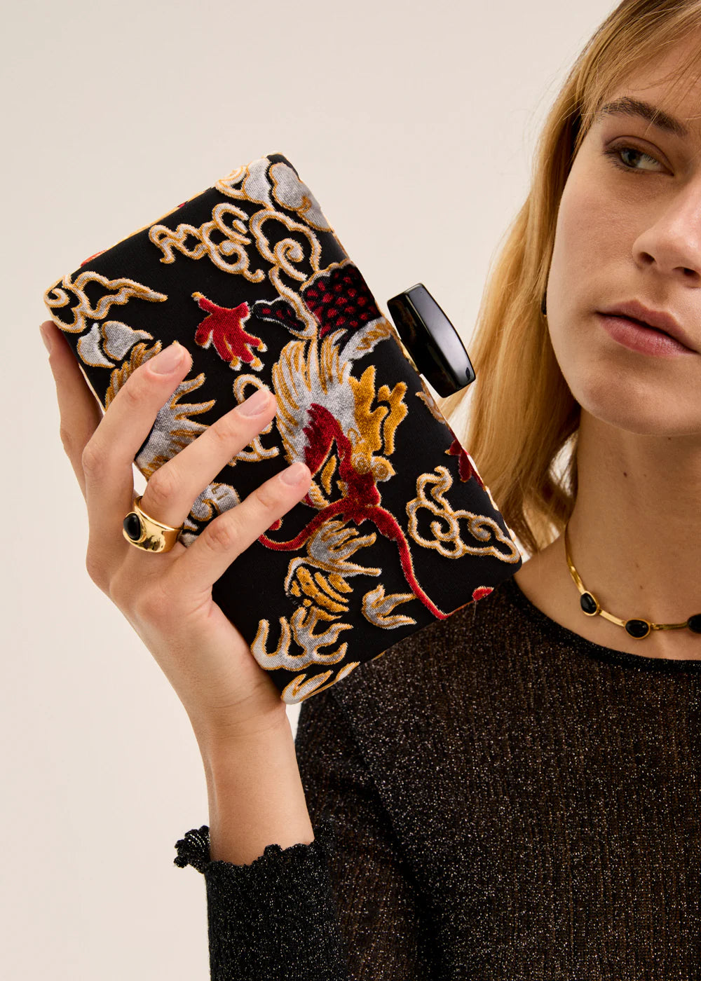 La clutch da donna in velluto firmata Nalì si distingue per il raffinato disegno di un dragone, che aggiunge un tocco di mistero e originalità al colore nero intenso. Questo accessorio sofisticato unisce materiali pregiati e design esclusivo, ideale per completare con eleganza e carattere ogni look serale.