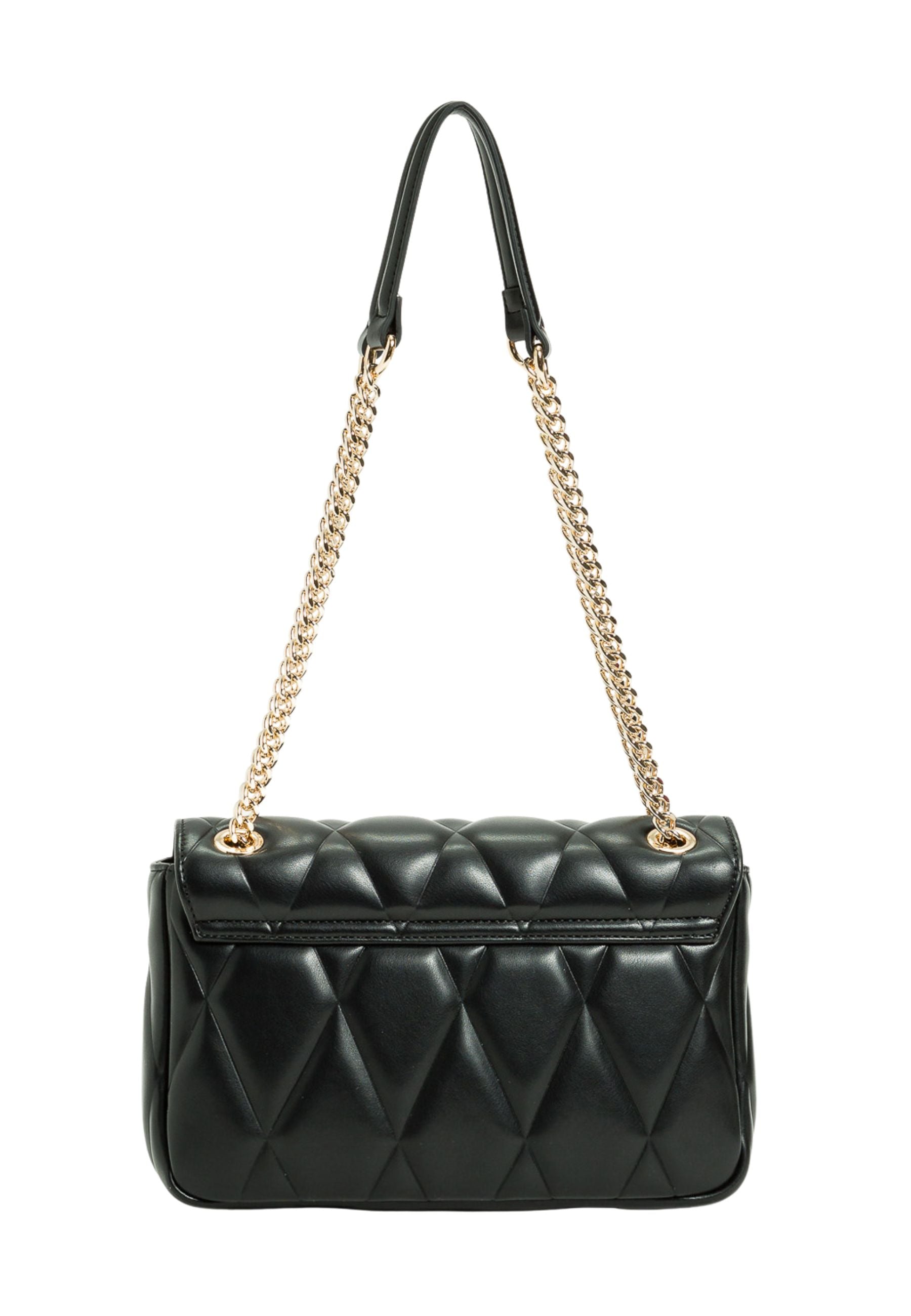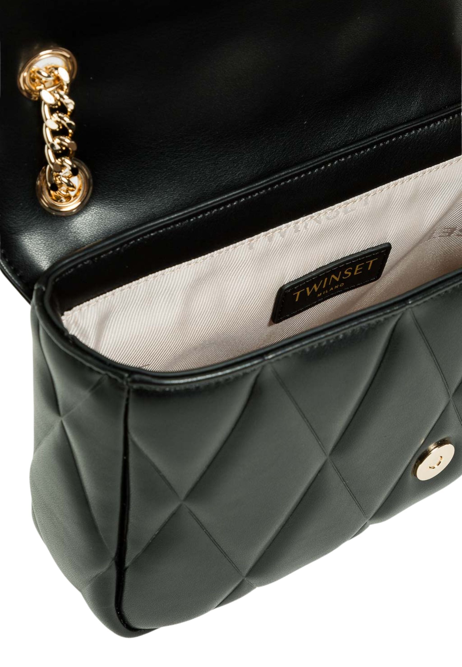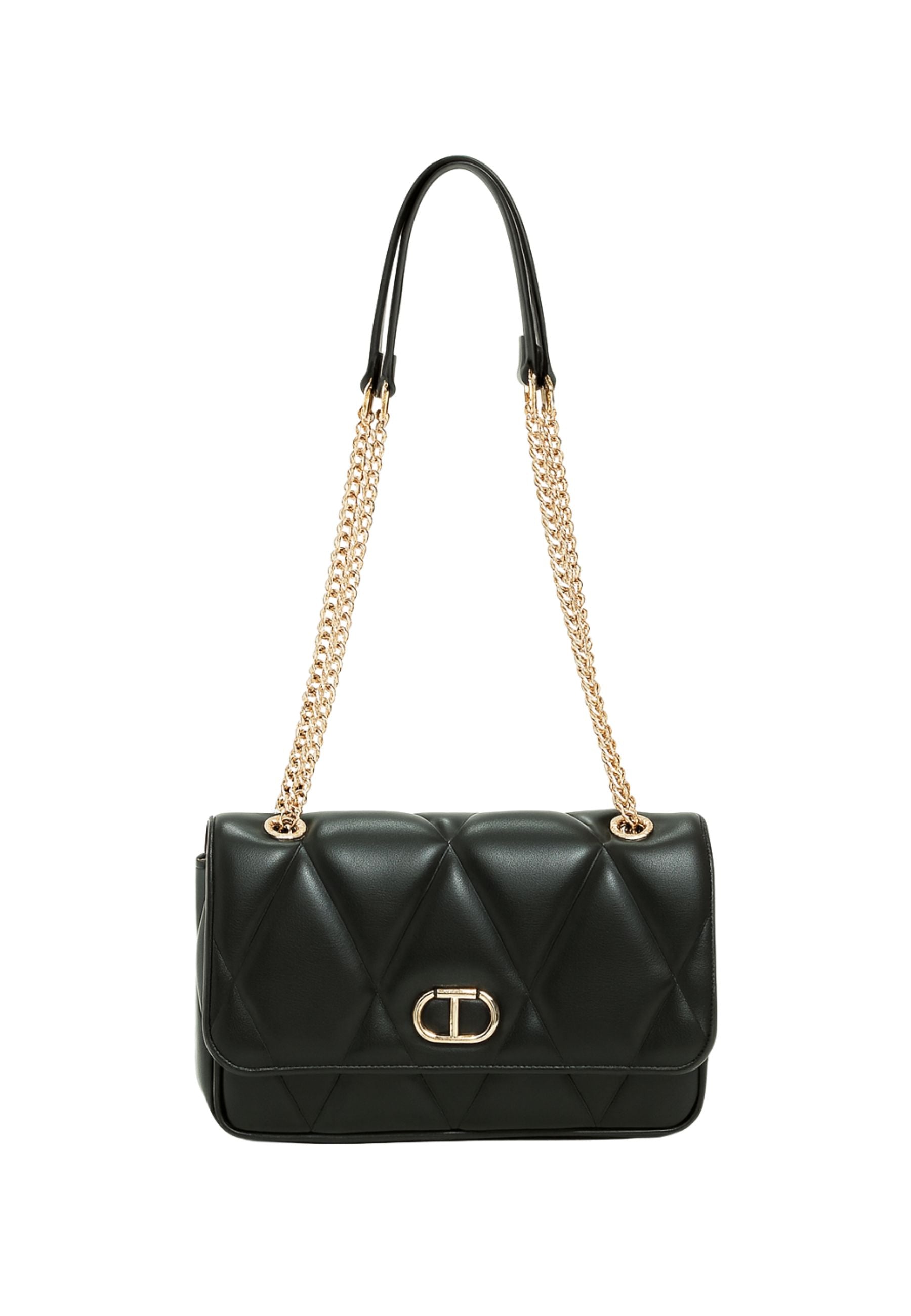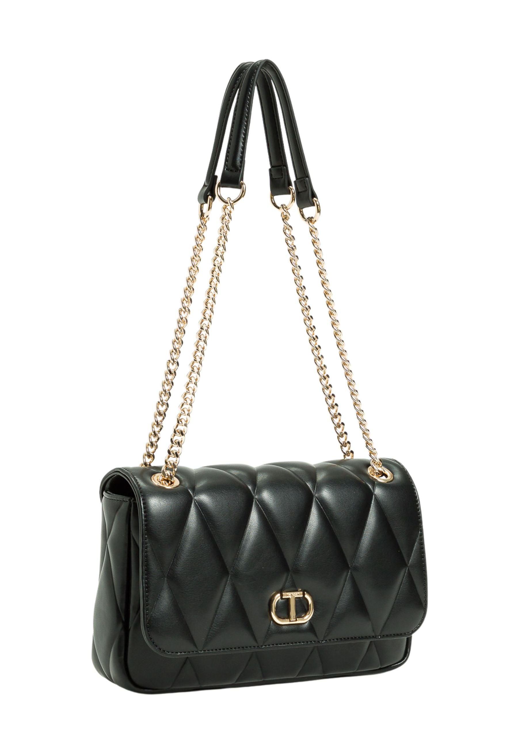La tracolla Twinset da donna in nero si distingue per il design raffinato con patta frontale, che unisce eleganza e praticità. Perfetta per chi desidera un accessorio versatile e sofisticato, capace di valorizzare ogni look con un tocco di classe discreta.
