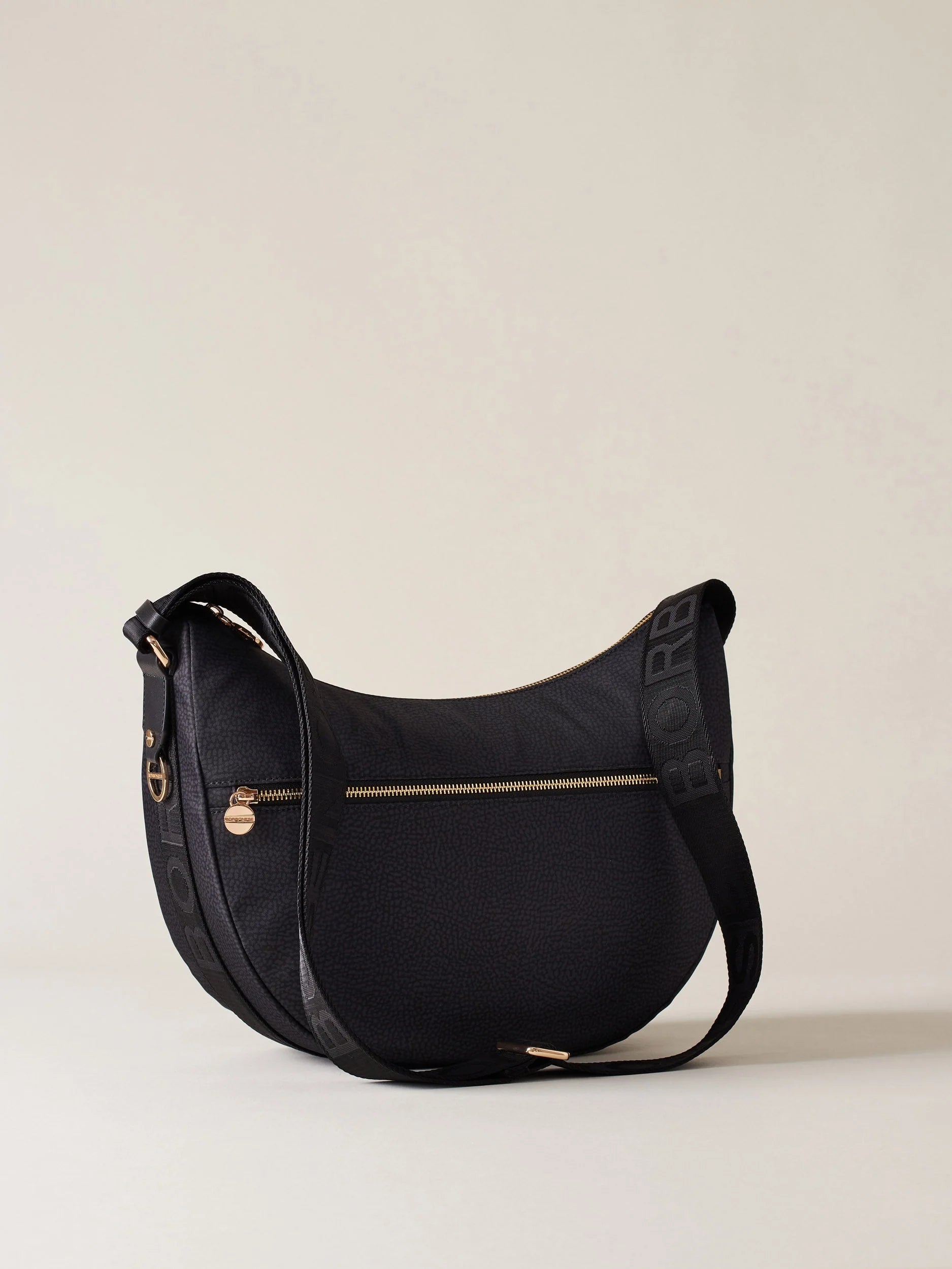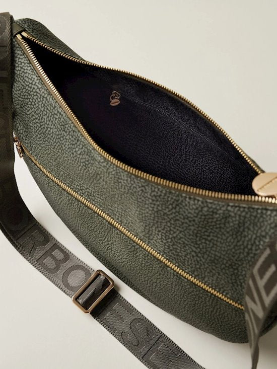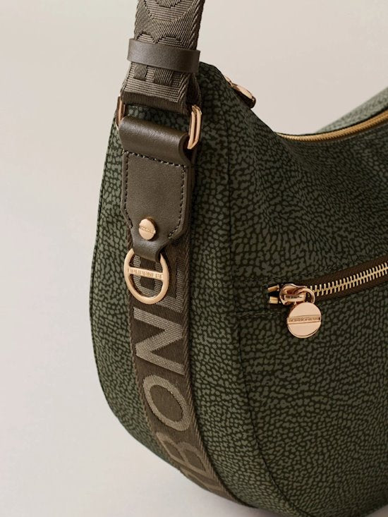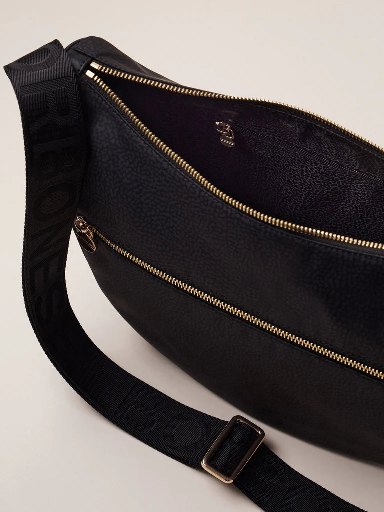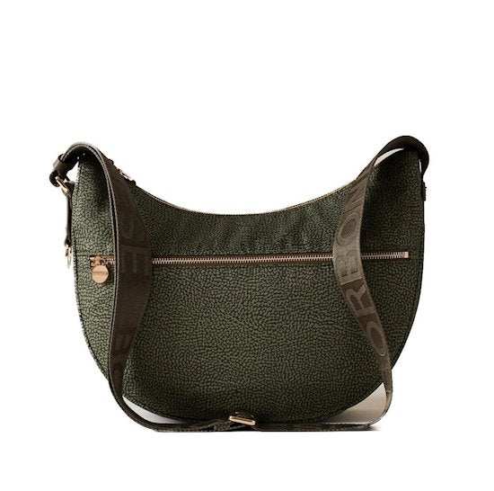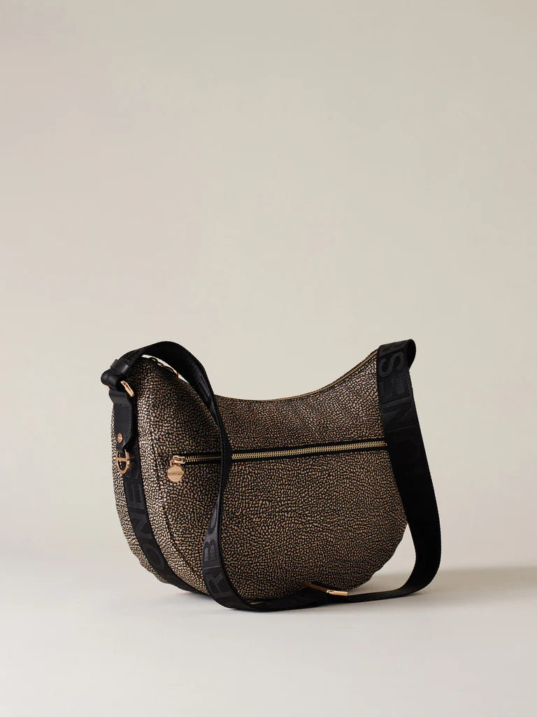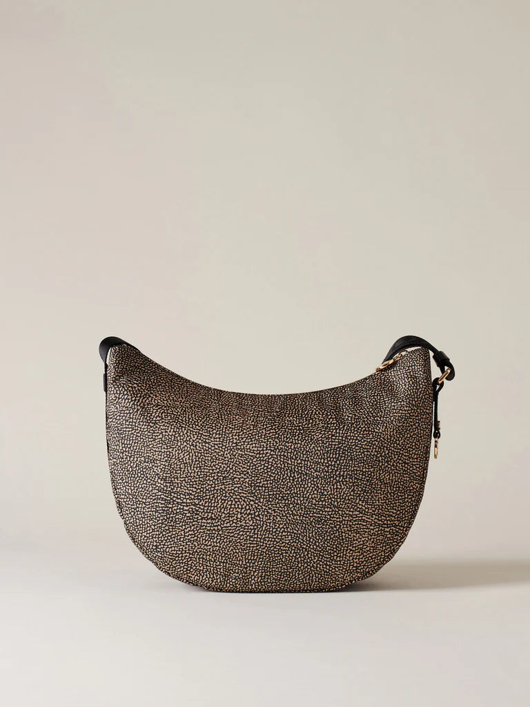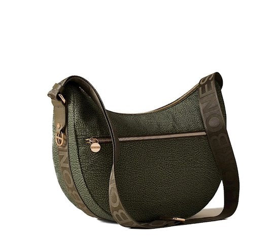 La Luna bag media da donna Borbonese, disponibile nei colori nero, naturale/nero e verde, si distingue per il suo design elegante e funzionale. La tasca esterna aggiunge praticità senza compromettere la raffinatezza, rendendola l’accessorio ideale per chi cerca stile e comodità in un’unica borsa.