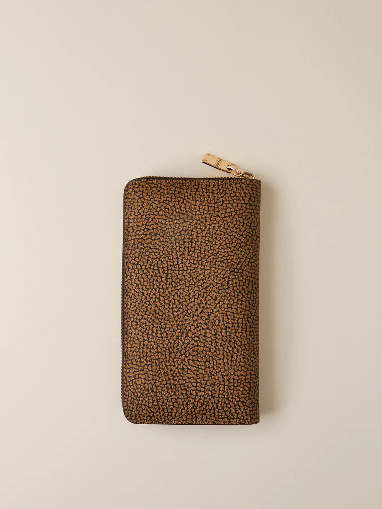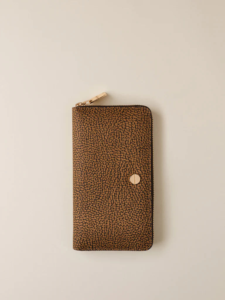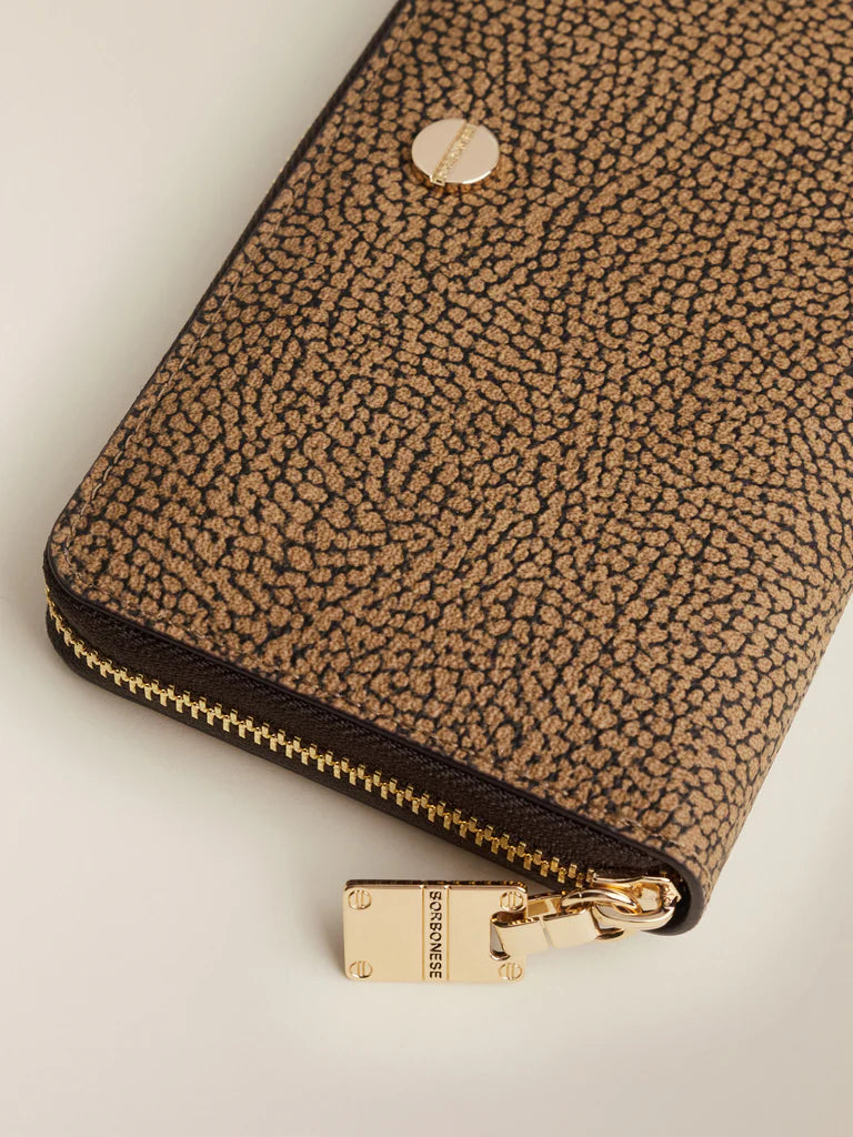 Questo portafoglio grande da donna Borbonese, caratterizzato dall’elegante combinazione di colori naturale e nero, offre ampio spazio e funzionalità grazie alla pratica chiusura con zip. Perfetto per chi cerca un accessorio raffinato che coniughi organizzazione e stile sofisticato in ogni occasione.