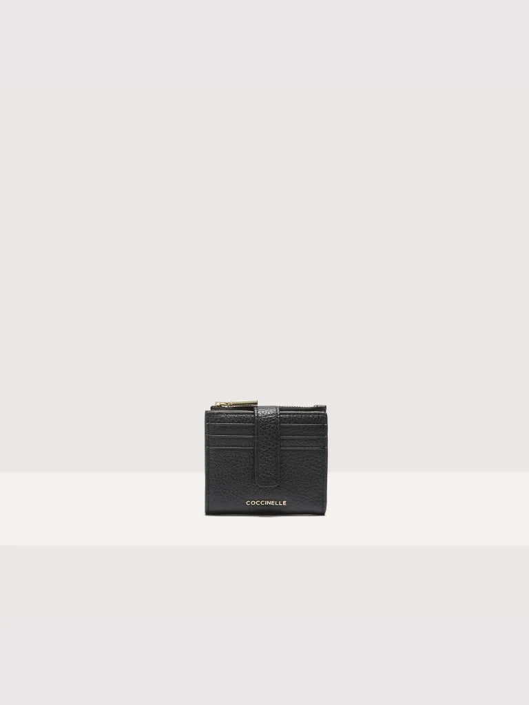 Portafoglio piccolo in pelle firmato Coccinelle, disponibile nei quattro eleganti colori nero, marrone, prugna e ribes. Progettato con tasche portacarte laterali che assicurano ordine e praticità, unisce un design raffinato a funzionalità essenziali, perfetto per chi cerca un accessorio compatto ed elegante.