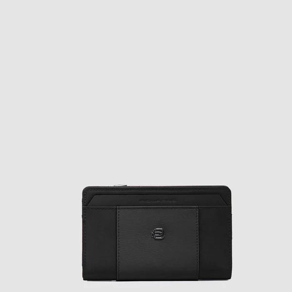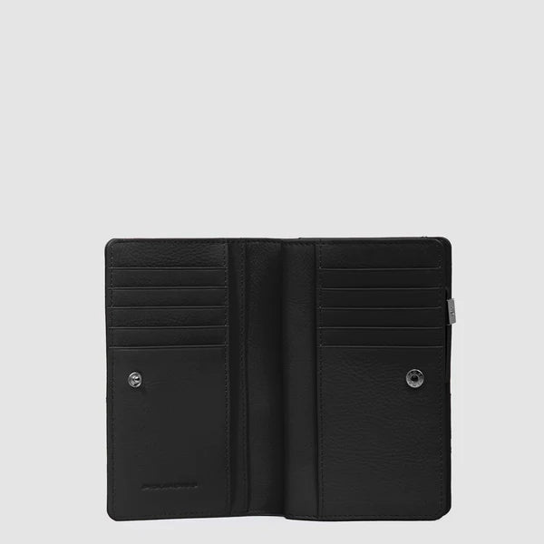 Portafoglio medio da donna Piquadro, realizzato in combinazione di pelle e tessuto, disponibile nei raffinati colori bordeaux e nero. Elegante e funzionale, offre spazio organizzato per carte e contanti, perfetto per chi cerca un accessorio sofisticato e versatile.