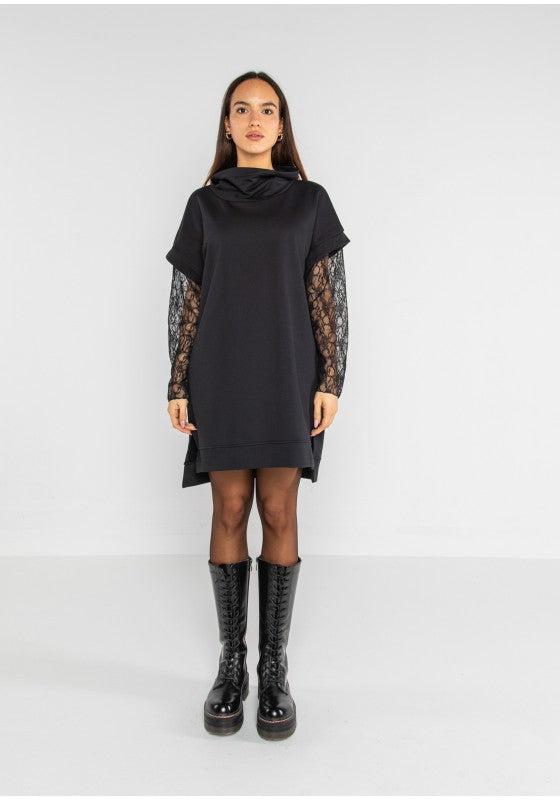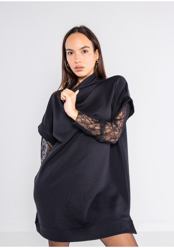 Questo abito corto da donna firmato Lokita unisce la morbidezza della felpa con l’eleganza delle maniche in pizzo nero, creando un equilibrio raffinato tra comfort e stile sofisticato. Ideale per chi cerca un capo versatile che valorizzi la femminilità con un tocco contemporaneo e di classe.